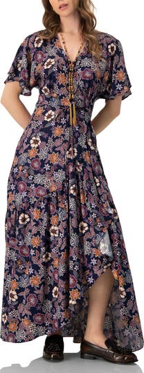 A floral print V-neck wrap maxi dress with short sleeves, perfect for any occasion.