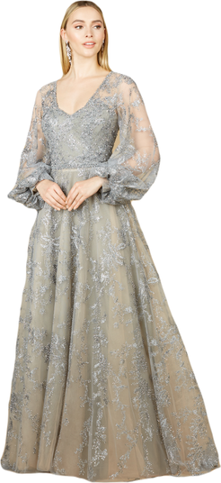 Long sheer balloon sleeves, v neck lace fabric ball gown. Embellished with rhinestones and lace embroidery. This is the perfect dress for anyone looking for a soft, elegant style, with arm coverage.
