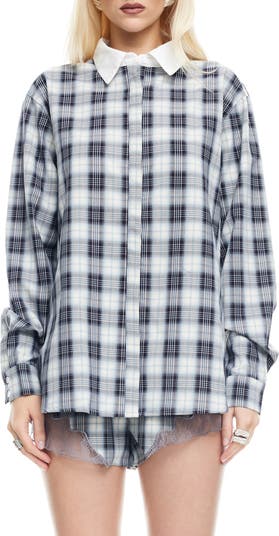 A crisp collar contrasts this cozy plaid shirt framed with dropped shoulders for a relaxed fit and finished with a tuckable shirttail hem.