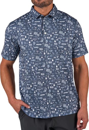 Our Vacation Nation polo in moody blue features white embellishments with icons that give a nod to travel. Crafted from a poly blend performance mesh, it offers breathability, moisture-wicking capabilities, and 4-way stretch. With low shrinkage and shape retention technology, it’s your go-to for all-day comfort and style.