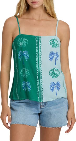 Stay cool and carefree in a breezy top embroidered with tropical motifs and finished with adjustable straps.