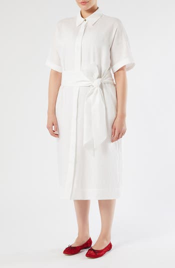 A defining tie belt shapes the silhouette of this crisp shirtdress framed by elbow-length sleeves and a perfectly flared skirt.