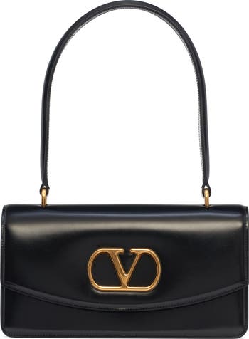 This sleek shoulder bag in polished calfskin leather features golden VLOGO hardware as the single gleaming detail on the front of the structured style.