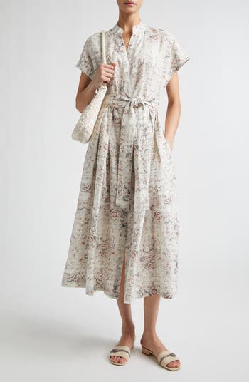 A faded floral print brings an antiqued patina to this relaxed-fit shirtdress cut with generous dolman sleeves and cinched at the waist with a wide sash.