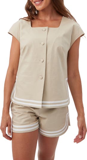 Short sleeve linen top with a square neck, full button front and contrast piping along the hem