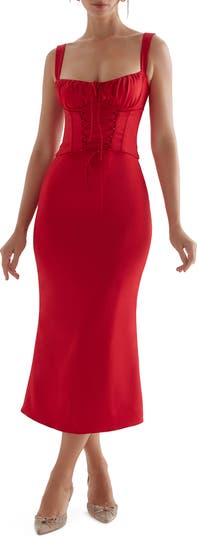 Turn heads in this stunning corset-inspired midi with a lace-up bodice and a flared hem all crafted of lightweight duchess satin.