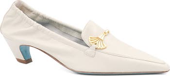 VALENTINA RANGONI Vetta pump in off white with Parmasoft construction for durable comfort. Genuine leather upper with Nappa leather lining and cushioned insole, plus a flexible leather sole and subtle hardware embellishment for all-day wear. Pointed toe, low 1/2 in block heel, standard US fit (width B) — a refined silhouette that transitions from office to evening.