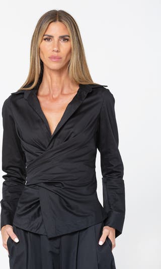 The Valentina Top is the epitome of tailored elegance with a modern twist. Designed in a sleek poplin fabric, this long-sleeve blouse features a sharp collar, plunging neckline, and a wrap-style front that cinches at the waist to create a sculpted, feminine silhouette.