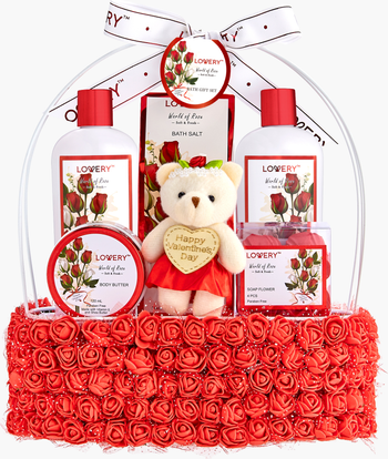 Valentine's and holiday gift basket - treat the special lady in your life to a red rose themed bath gift basket stuffed with delightful self-care goodies. It will make her feel like the pampered woman she is! This beautiful handmade basket is filled with aromatic scented bath and body products.