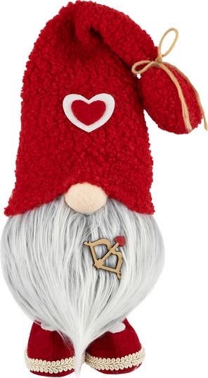 Love is in the air with this enchanting Valentine's Day gnome figurine! This adorable gnome boasts a pointy hat adorned with a heart and a bow and arrow, ready to strike the hearts of lovebirds everywhere. Our lovable gnome is the perfect addition to your Valentine's Day décor or a heartwarming gift for that special someone. Product Features: Valentine's Day gnome Gnome wears a red pointy hat decorated with a heart and red and white shoes Comes with a cupid bow and arrow attached to his beard Comes with a weighted bottom for stability For indoor use only Dimensions: 19.5"H X 5.5"W X 4"D Material(s): fabric/wire/faux fur