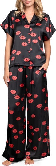 A kiss print covers the soft and silky satin fabrication of a top and pants pajama set that makes a perfect gift for Valentine's Day.