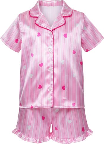 - Soft pink satin pajama set featuring delicate heart details and subtle stripe accents