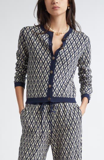 Alessandro Michele fell under the spell of archival references in his debut collection, 'Avant les Débuts,' and this long-sleeve cardigan knit from virgin-wool yarn has a '70s attitude in 'Toute la V' jacquard.