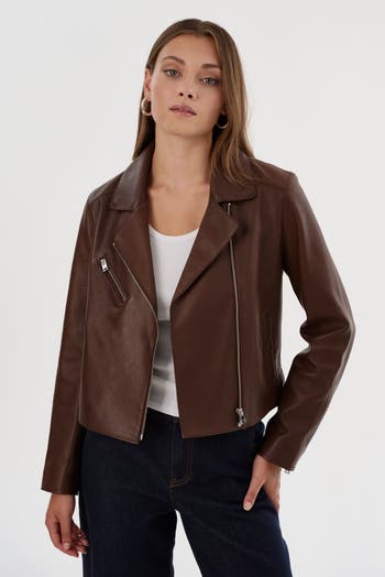 The leather jacket is very well made—the leather is soft, high quality, and seems resistant to scratches and creasing. The only downsides are that the sleeves are slightly longer than typical (they fall below my wrist) and the waist runs wide. I’m usually an extra small in leather jackets, but in this style I could definitely size down to an extra-extra small. It hits right at the waist—not exactly cropped, but above the hips—making it a great option for shorter-waisted figures. On the plus side, there’s plenty of room to layer a medium-weight sweater underneath and the hidden side pockets are a nice alternative to the silver zippered pockets on most moto jackets. The brown color is also very elevated—an expensive-looking dark tan that will be extremely versatile. Overall, it’s a great price for a high-quality jacket.