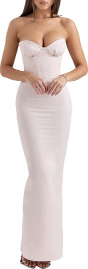A corset-inspired bodice and strapless profile create sultry elegance on a luxe satin gown cut in a fitted silhouette that hugs in all the right places.