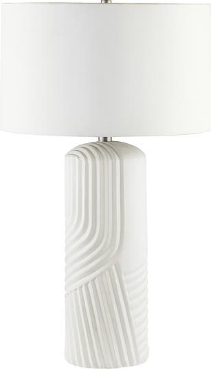 Wavy lines curve around this contemporary ceramic table lamp that adds a stylish glow to any space.