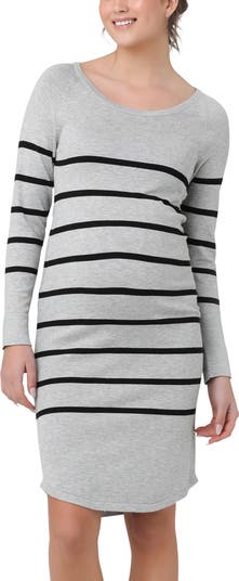A chic knitted dress is a cold weather maternity essential, making everyday styling easy. The Valerie Tunic Dress, featuring a curved hem and contrast stripes, will see you through all stages of your pregnancy. Fully fashioned rib knit Shirt tail shaped hem Semi fitted Sits above the knee Two tone stripe design Viscose / Nylon