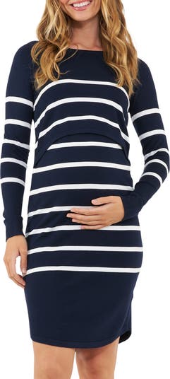 - Semi fitted Fully fashion striped knit Scoop neckline Shirt tail hemline Long sleeve Nursing 72% Viscose, 28% Nylon Length: 98cm (size small)