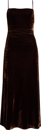 Rich, ruched velvet elevates this event-ready midi dress designed to gently drape your silhouette, while the spaghetti straps show off your shoulders.