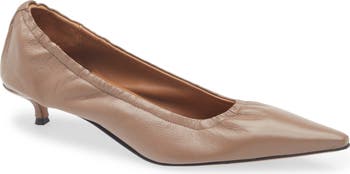 A stretchy topline brings a customized feel to an Italian-made leather pump balanced by a pointy toe and kitten heel.