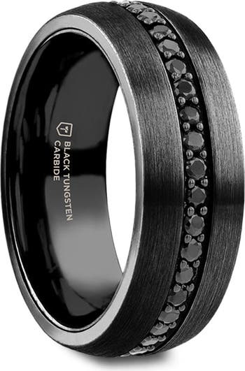 The Valiant Men's Black Sapphire Tungsten Ring shows him he's your hero. Round cut black sapphires glisten along the center groove of this elegant men's wedding band of brushed black tungsten carbide. A tungsten sapphire ring is a treasure of commitment forever.
