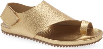 A wide, asymmetric strap and single toe loop add crisp angles and dimension to a metallic leather sandal featuring an adjustable closure and flexible sawtooth sole.