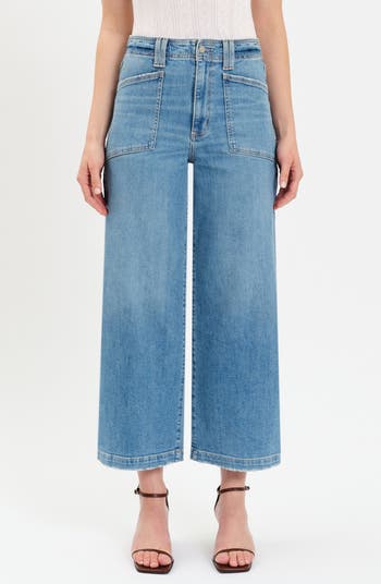Wide legs create an irresistible silhouette on these stretchy light-wash jeans updated with patch pockets and raw hems.