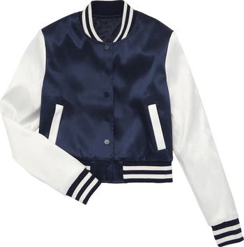 Soft satin exterior. Quilted lining. Center back snap button closure. Classic varsity design. Perfect layering piece.