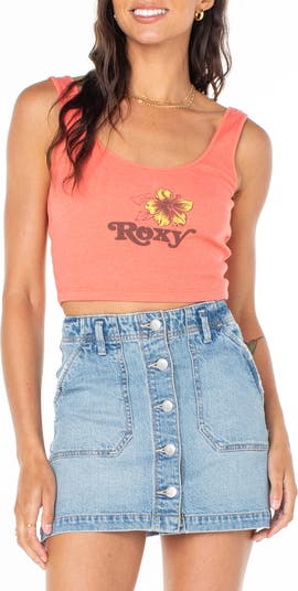 A vintage-inspired logo graphic at the chest adds some cool retro charm to a ribbed tank cut to a cute abbreviated length.