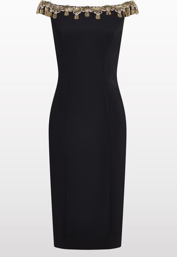 Elegant and understated, this cocktail dress features a refined column silhouette that skims the body with effortless precision. The off-the-shoulder neckline is delicately embellished, adding a touch of luminosity to its clean, structured form. Minimal yet intricate, it embodies timeless sophistication ideal for receptions, elegant soires, or refined celebrations.