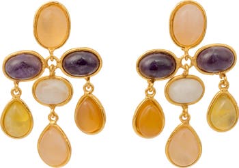 Gold plated brass Earrings "Valse" - Vibrant multi-stone drop earrings set in gold, featuring warm peach, amethyst, moonstone, and golden hues. A bold, elegant statement piece with a luxurious bohemian charm.