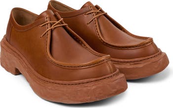 A rippled platform and chunky heel enhance the texture of this remixed leather derby fronted by a pronounced moc toe.