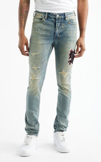 Grungy fading, repaired holes and a bouclé logo patch anchoring one thigh bring conversation-starting history to jeans branded with iconic t-box and 4x4 details on the rear. Sitting just below the waist, they sport a contour-hugging fit that's not overly skinny and puckered hems that bunch comfortably at the ankles.