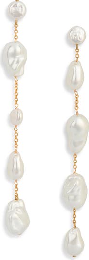 Delicate chains connect organic-shaped faux pearls to create these lustrous and dramatic drop earrings.