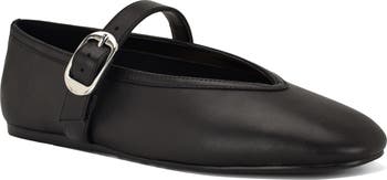 Polished hardware and a V-cut topline highlight the streamlined profile of a rich leather flat featuring an adjustable mary jane strap for a secure fit.