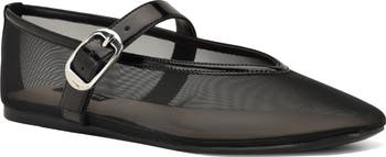 A V-cut topline and glossy faux-leather trims highlight the streamlined profile and mesh upper of a ballet flat featuring an adjustable mary jane strap for secure wear.