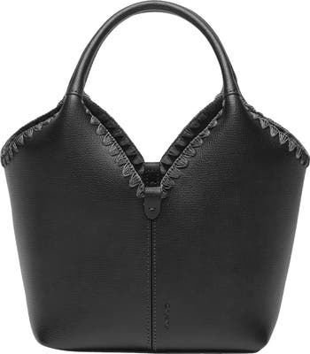 Hand-stitched trims evoke the brand's artisanal sensibility on a voluminous leather satchel featuring a removable pouch and optional crossbody strap for on-the-go convenience.