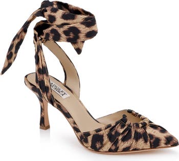A fierce leopard print highlights the gathered fabric upper on a party-ready pointy-toe pump lofted by a svelte heel and secured with alluring ties that wrap around the ankle.