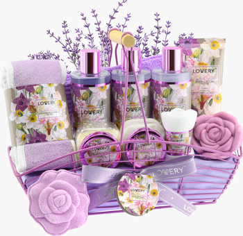 Deluxe 13 piece spa set - this spa gift basket has everything a woman needs! It includes shower gel, bubble bath, shampoo, body lotion, body scrub, bath salt, rose bath soap, loofah back scrubber, rose bath bomb, bath towel, moisturizing shower gloves. Packed in a stunningly wrapped wired bread basket, it also has a gift note card for you to personalize it.