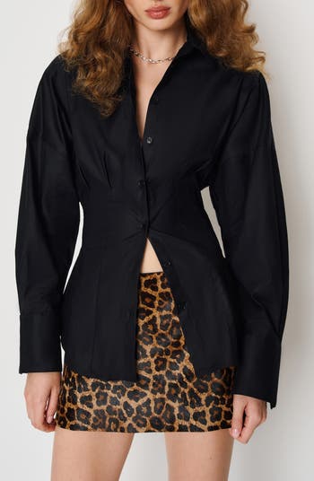 Reformation turns the typically staid button-up shirt into something sultrier with this crisp stretch-poplin option featuring contoured seaming that mimics classic corsetry. Rounded, dropped shoulders counterbalance the cinched silhouette.