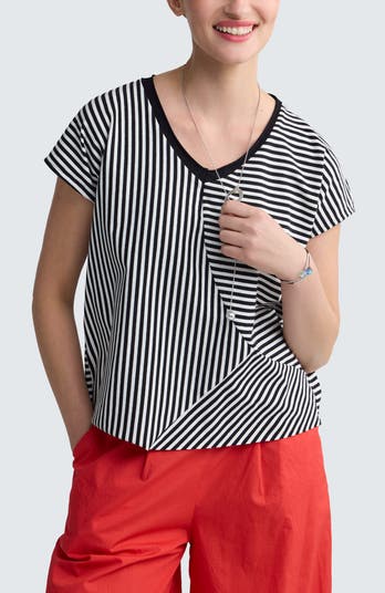 Sophisticated V-neck top in soft striped cotton jersey. Features a straight H-shape silhouette, short sleeves, and hip-length hem. A modern, graphic foundation piece.