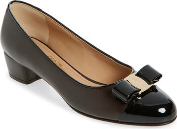 A signature Vara bow highlights the glossy cap toe of this colorblocked leather version of the brand's classic low-heel pump.