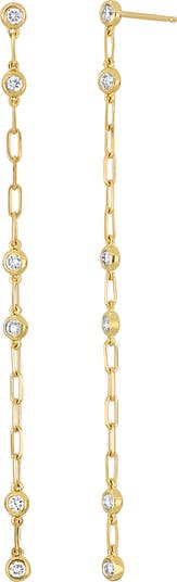 Round diamond bezels and airy 18-karat gold links drape from your lobes in these handcrafted drop earrings.
