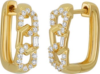 Round and emerald-cut diamonds dazzle the angular links that front these handcrafted hoop earrings of 18-karat gold.