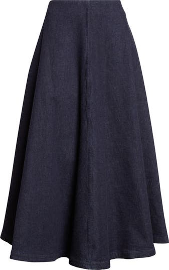 Minimalist styling and a solid hue bring pair-with-anything versatility to this stretch denim skirt in an always-timeless A-line silhouette.