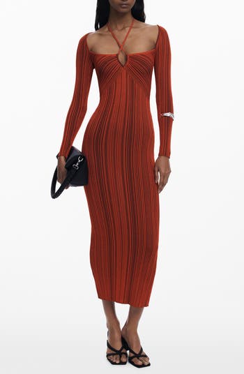 A sultry neckline combines with a curve-skimming fit to add a shot of smolder to this knit dress.