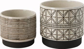 - Give the plants a stylish home with these brown and white stoneware planters that feature a geometric line pattern and a matte finish