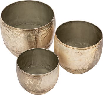 This set of three distressed pewter metal planters is a great way to add some charm and personality to the home. These planters are made of durable and durable metal with a distressed pewter finish that creates a rustic and antique look. The planters feature a round shape and a smooth surface that showcase the beauty of the metal. The planters come in varying sizes that offer a stylish and versatile solution for displaying any favorite plants. Use them indoors or outdoors, as they are weather-resistant and easy to clean. The planters measure 7 inches in diameter and 6.5 inches in height, 6 inches in diameter and 5.5 inches in height, and 5 inches in diameter and 4.5 inches in height, holding 6-inch, 5-inch, and 4-inch pots respectively. Mix and match these planters to create a stunning display that suits any space and style. These planters are suitable for farmhouse, industrial, and vintage decor styles, as their distressed pewter finish adds character and complements both traditional and contemporary settings. This set of three distressed pewter metal planters is a wonderful addition to any home that loves rustic charm and natural beauty.