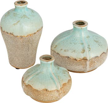 This set of terra-cotta vases with a distressed finish adds charm and character to any home. These terra-cotta vases are designed to look like old-fashioned pottery with unglazed bottoms and reactive glaze tops, giving them a rustic and cozy appeal. These vases are perfect for displaying faux, dried, or real flowers in any room. They can also create a contrast with the greenery of the plants, making them stand out and catch the eye. The set includes three different shapes and sizes. Vase 1 measures 3.5 inches round and 6 inches high. Vase 2 measures 5 inches round and 4 inches high. Vase 3 measures 4 inches round and 3.25 inches high. These rustic terra-cotta vases with distressed finish are a lovely way to add some personality and style to any home.
