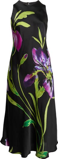 Lustrous satin brings slinky movement to this floral midi dress fashioned in a figure-skimming silhouette.